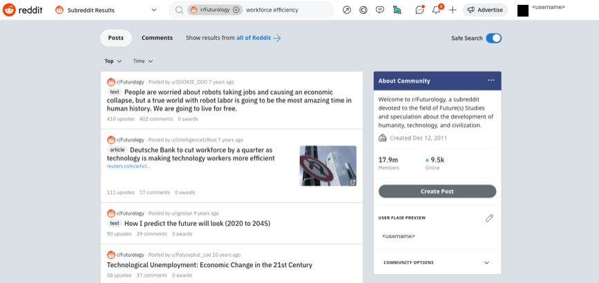 c. Reddit – The ‘Front Page of the Internet’ has an incredible futures community and they share and discuss amazing developments in the world. It’s a free social media platform and you can find incredible references there and bookmark them for reading and sharing later. The core community for Future(s) Studies is https://www.reddit.com/r/Futurology/. You can enter search phrases at the top of the page to focus in on specific areas and then click through to the articles and deeper discussions.
