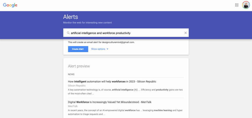 a. Set up Google Alerts for key areas of interest for your business – you just need a Google Gmail account to do this and you can enter whatever. Just go to https://www.google.com/alerts and type in the area of exploration as you would do a Google Search: